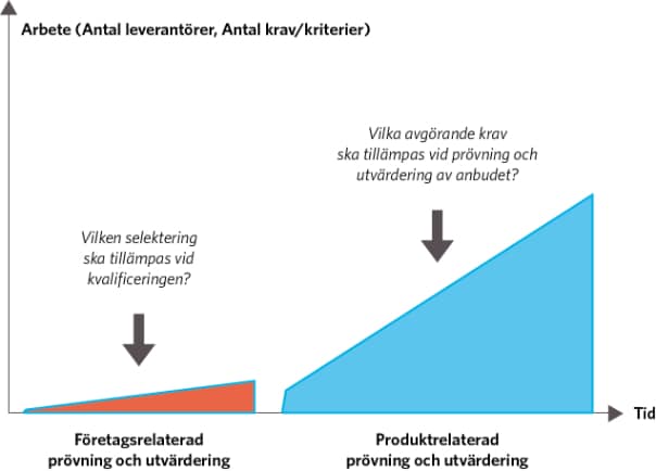 Detta förfarande innebär att upphandlaren strategiskt sett överväger frågorna enligt figuren nedan för att välja bästa anbud, där en kraftig gallring kan utföras i det första steget. I figuren symboliserar ytorna arbetet, där en smart strategi kan skapa en upphandling som kan genomföras på kort tid, med bra resultat och till en låg kostnad. Detta angreppssätt är också synnerligen lämpat då upphandlingen avser ramavtal.