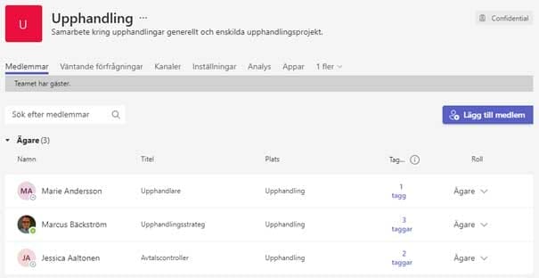 När vi diskuterar upphandlingar på den digitala arbetsplatsen så gör vi det i ett team som heter Upphandling. Alla som ska jobba med enskilda upphandlingar blir inbjudna i teamet. Alla personer ”taggas” med minst en tagg för att visa vilket deras specialistområde är. Förutom jag och mina kollegor (se bilden nedan) som är taggade med till exempel [upphandling] eller [uppföljning] så kan medlemslistan i teamet se ut enligt nedan: